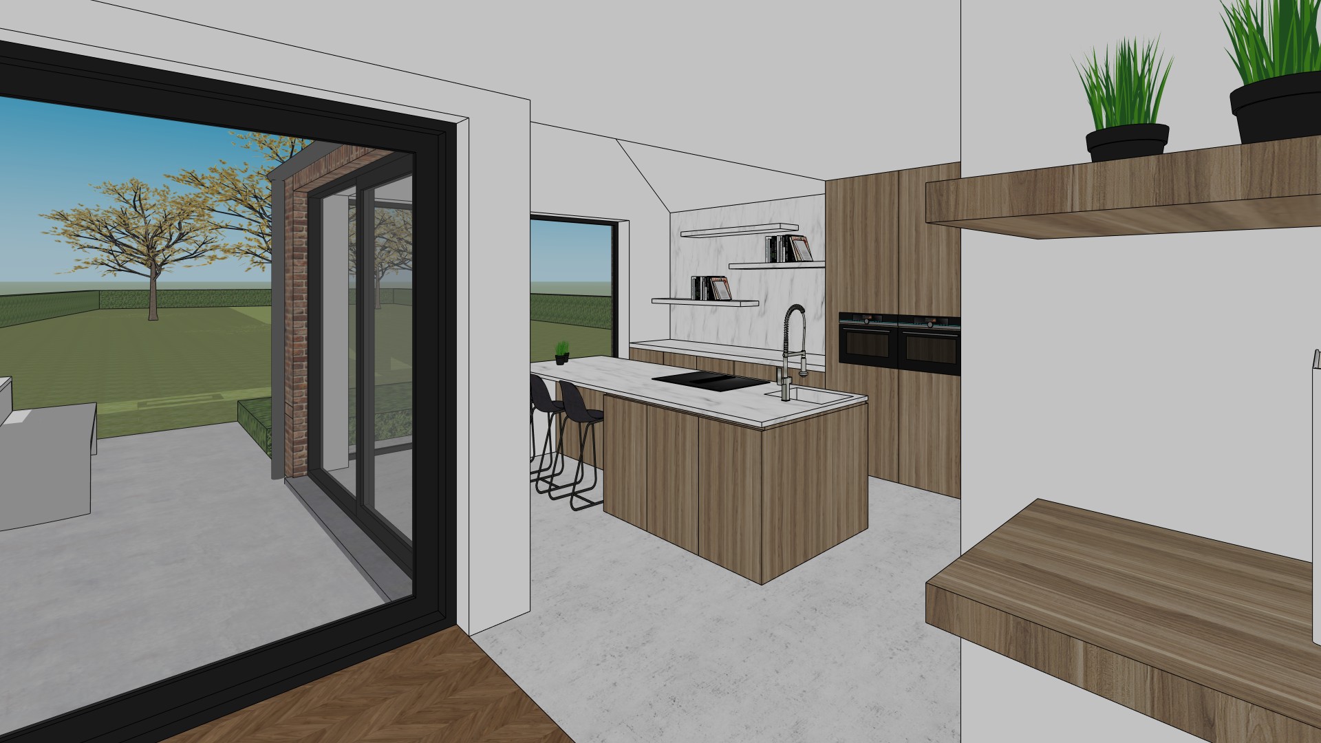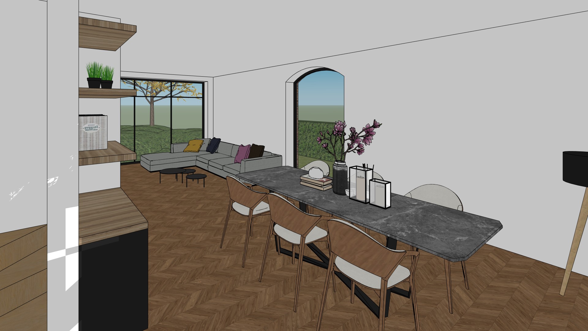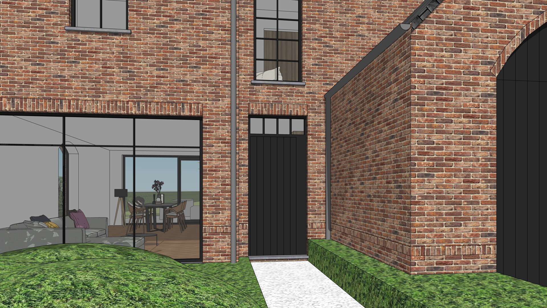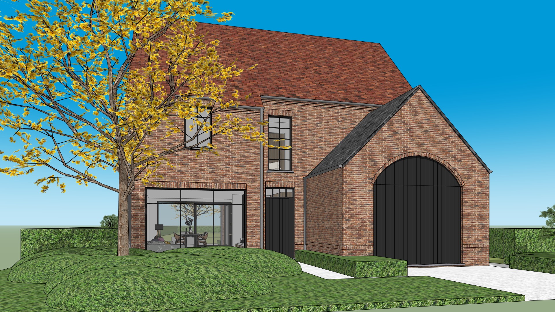 Dit ontwerp bevat een klassiek moderne bouwstijl met een mix tussen klassieke charme en een eigentijdse uitstraling. Warme genuanceerde bakstenen sluiten aan bij de landelijke context. Er werd aandacht geschonken aan het samenspel van traditionele volumes en moderne raampartijen waarbij we overvloedig daglicht integreren in het interieur en bijkomend het uitzicht naar de tuin.